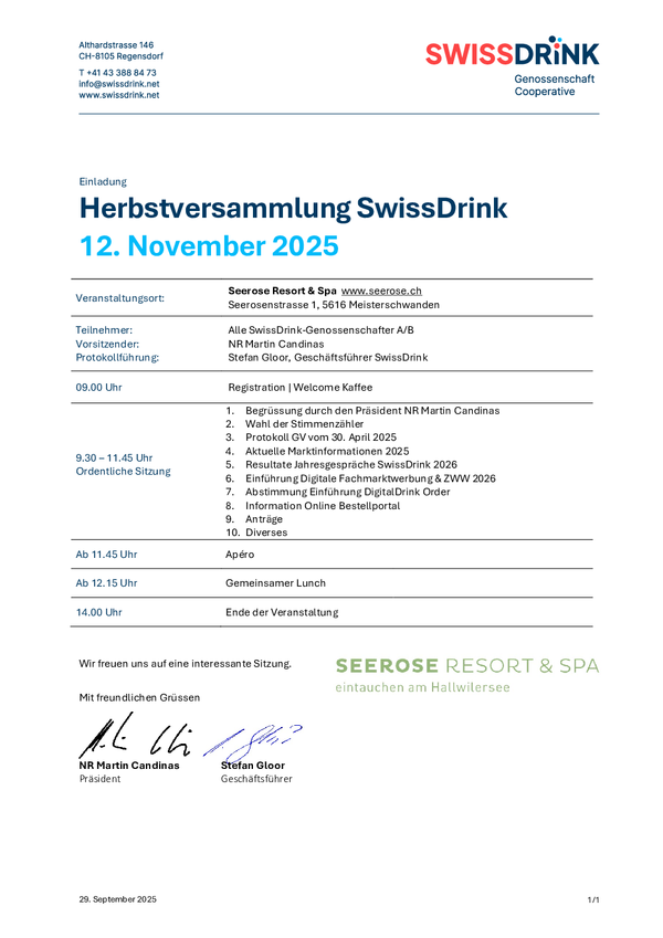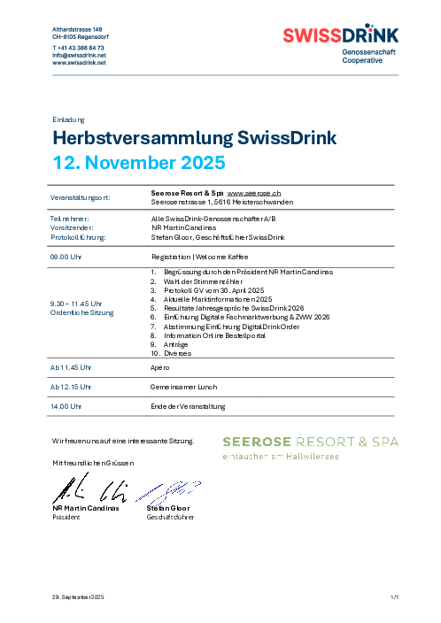 Wir freuen uns, Sie zur kommenden SwissDrink Herbstversammlung einladen zu dürfen.