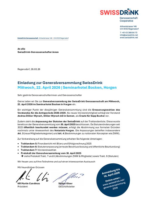 Zudem steht die Anpassung der Statuten der SwissDrink auf der Traktandenliste. Diese wurde bereits an der Generalversammlung vom 30. April 2025 beschlossen. Da Statutenänderungen seit 2023 öffentlich beurkundet werden müssen, erfolgt die Abstimmung aus formalen Gründen nochmals unter Anwesenheit des Notariats Horgen.