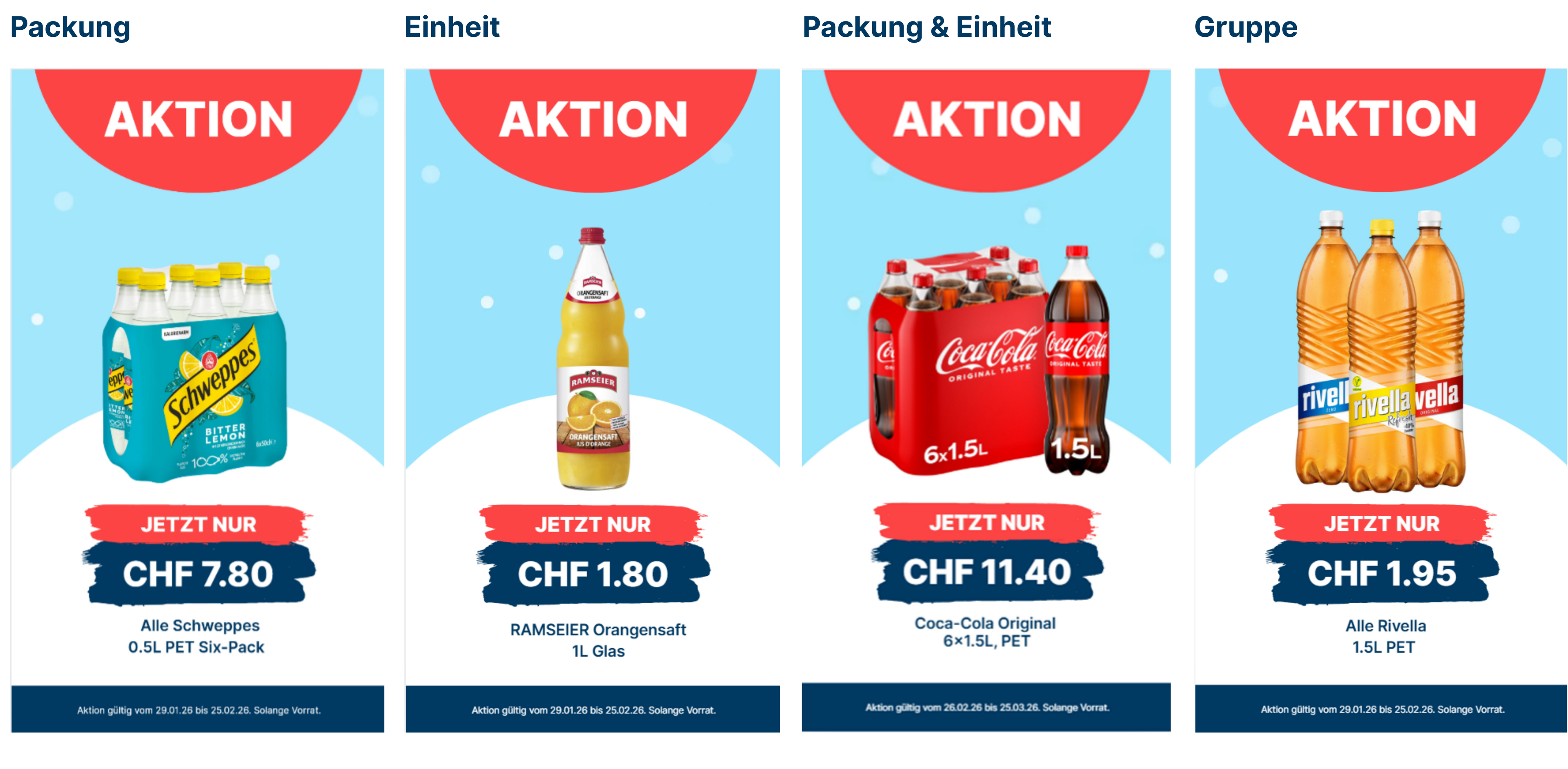 Für Aktionen und Neuheiten werden verschiedene Abbildungsvarianten zur Verfügung gestellt, dies für die optimale Abbildung der Produkte und Preisgestaltung.