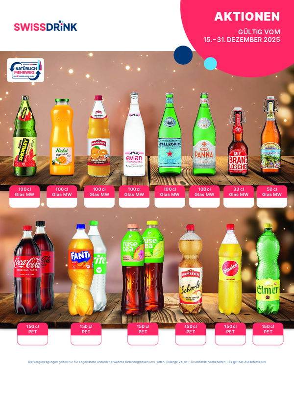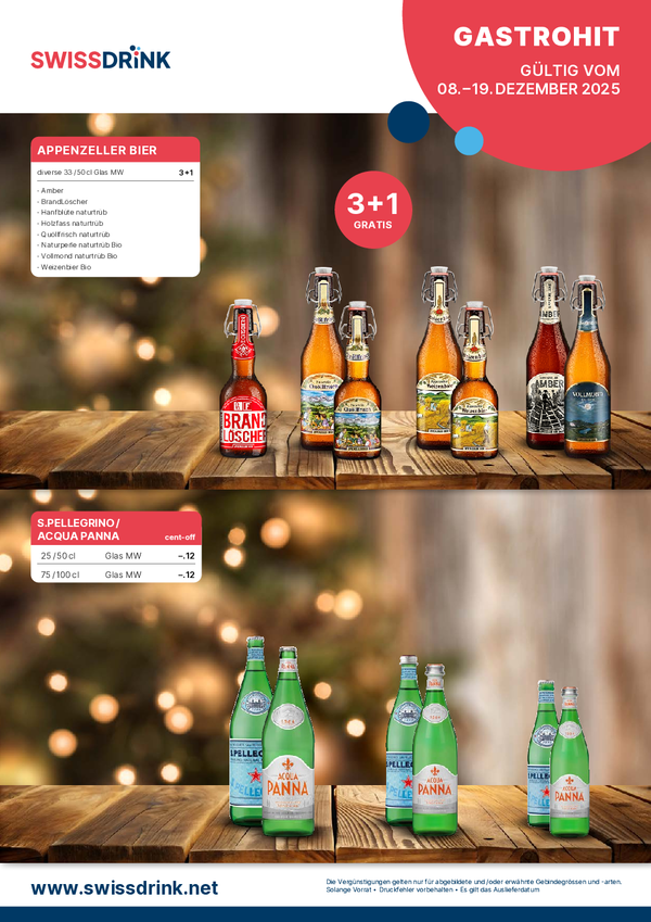 Jeden Monat überrascht SwissDrink Sie mit neuen unschlagbaren Angeboten und Aktionen. Die Aktionsartikel sind jeweils für eine bestimmte Zeit und nur erhältlich, solange der Vorrat reicht. Nebst monatlichen Aktionen erwarten Sie zudem tolle HAMMERAKTIONEN und SUPER HIT Angebote.